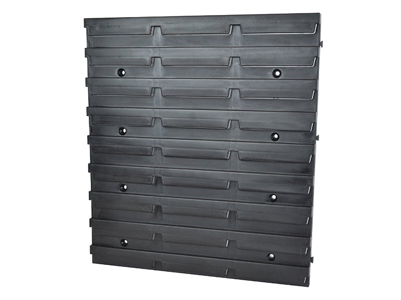 Plastic slatted wall panel allowing various combinations of Faithfull Interlocking storage bins and parts boxes to be wall mounted. Ideal for use in both professional workshops or for home storage.