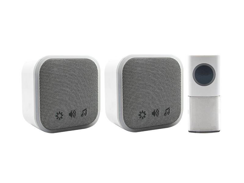 Portable and Plug-In Door Chime set for use all around your home. The set extends your door chime system, so for example you can have the plug-in unit permanently in a hallway and the portable unit to take with you anywhere in the home or garden. The Door Chimes are wireless, so no wiring is required, and with an extensive operating range of up to 150m, you never have to miss a visitor or delivery. With 30 different chime melodies to choose from, 90dB(A) sound output with volume control and a flashing blue chime alert, you will always know when somebody is at your door.